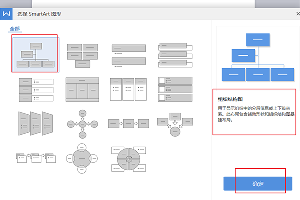 2、在SmardArt里面就可以看见组织架构图。点击确定就可以使用。